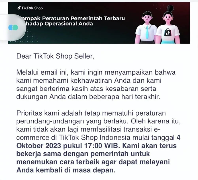 2023年10月份,在東南亞如日中天的TikTok突然收到印尼市場(chǎng)的一紙禁令,要求TikTok將社交媒體和線上交易活動(dòng)分開,一夜之間,600萬(wàn)TikTok賣家賬戶,以及數(shù)以百萬(wàn)計(jì)使用TikTok Shop賺錢的內(nèi)容創(chuàng)作者生計(jì)就此歸零。
