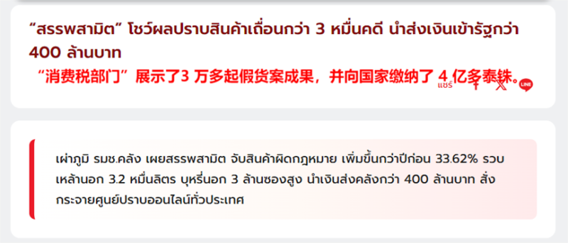 此前,泰國稅務部就發布消息稱,各部門積極打假已經取得顯著成效:根據官方機構統計,2024年泰國收繳的假冒偽劣商品總價值高達4.4592億泰銖,查案數量也比上年同期增長45.79%,達到3萬多起。