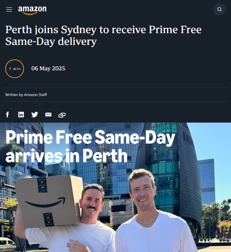 5月8日消息,亞馬遜近日宣布,在澳大利亞西部城市珀斯推出Prime會(huì)員免費(fèi)當(dāng)日達(dá)服務(wù)。繼悉尼之后,珀斯成為澳大利亞全國(guó)第二個(gè)開通該服務(wù)的城市。這標(biāo)志著亞馬遜持續(xù)推進(jìn)其在澳大利亞市場(chǎng)的物流速度提升,致力于為Prime會(huì)員提供更快捷、更便利的購(gòu)物體驗(yàn)。