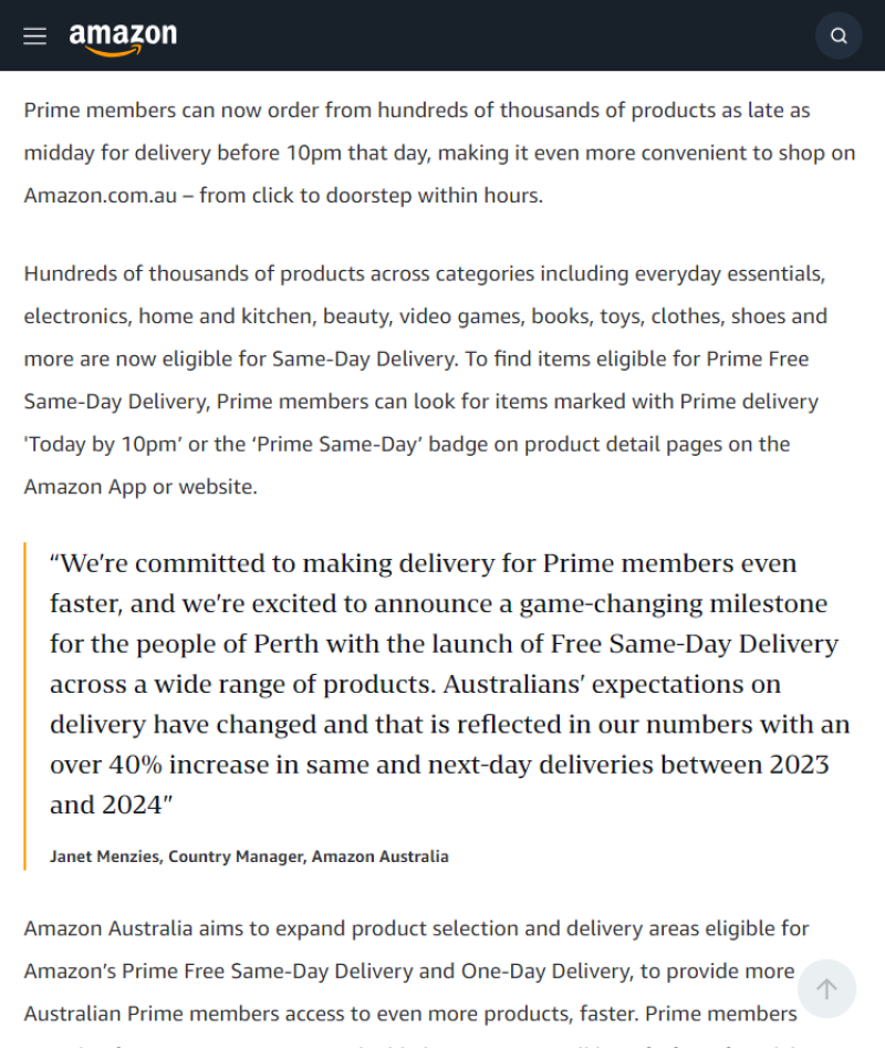 數(shù)據(jù)顯示,消費(fèi)者對(duì)物流速度的預(yù)期不斷提升,2023年-2024年間,澳大利亞地區(qū)的當(dāng)日達(dá)和次日達(dá)訂單增長(zhǎng)超過40%,凸顯出用戶對(duì)快速配送服務(wù)的高度認(rèn)可。此前,亞馬遜已在悉尼為Prime會(huì)員提供免費(fèi)當(dāng)日達(dá)服務(wù),覆蓋該城市90%以上的人口。此次擴(kuò)展,標(biāo)志著亞馬遜在澳大利亞加速建設(shè)本地履約網(wǎng)絡(luò)和供應(yīng)鏈體系。