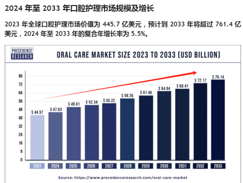 從市場規模來看,近年來全球口腔護理市場規模呈現出穩步上升的趨勢。據Statista數據預測,全球口腔護理市場規模持續增長,到2028年,市場規模將達到601.4億美元。無獨有偶,PrecedenceResearch同樣對市場的發展前景持以積極態度,認為全球口腔護理市場價值將從2023年的445.7億美元躍升至2033年的761.4億美元,復合年增長率為5.5%。