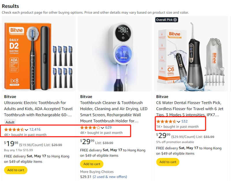 比如說,美國健康與美容品牌GuruNanda就是一大典型代表。該品牌主營漱口水、美白牙貼等產品,不僅曾經是亞馬遜健康與家居類目最暢銷的產品,還在TikTok Shop用一款椰子美白牙貼創造了月銷超6萬單、成交金額近60萬美金的銷售紀錄。再比如說,口腔護理品牌Bitvae主打的水牙線、電動牙刷等,也成為了亞馬遜等跨境電商平臺的熱賣爆款,月銷好幾千單。