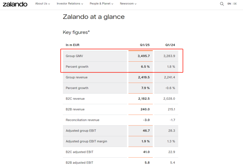 財報顯示,Zalando第一季度營收增長7.9%,至24億歐元,而去年同期為22億歐元,這得益于Zalando營銷服務的強勁表現。商品交易總額(GMV)增長6.5%,至35億歐元。調整后的息稅前利潤增至4670萬歐元,對應利潤率增長0.7個百分點至1.9%。