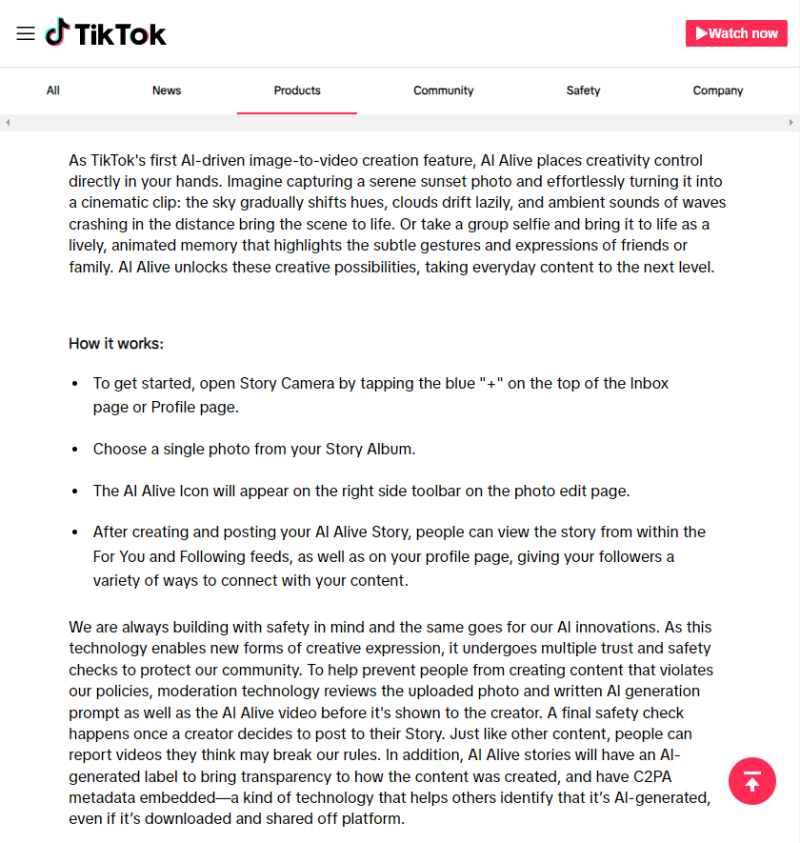TikTok表示,所有通過AI Alive生成的視頻內容將自動標注“AI生成”標簽,并嵌入C2PA元數據。該元數據標準可在視頻被下載或分享到TikTok以外平臺后,依舊保留AI創作的可識別性,提升透明度和內容溯源能力。