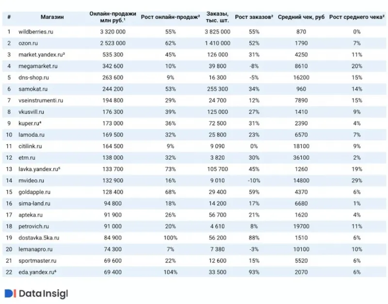 另外,來自研究公司Data Insight發布的年度“俄羅斯百強在線商店評級”顯示,2024年Wildberries以3.32萬億盧布、380萬份訂單量以及870盧布的平均訂單金額,連續第9年成為俄羅斯電商市場的領先者。