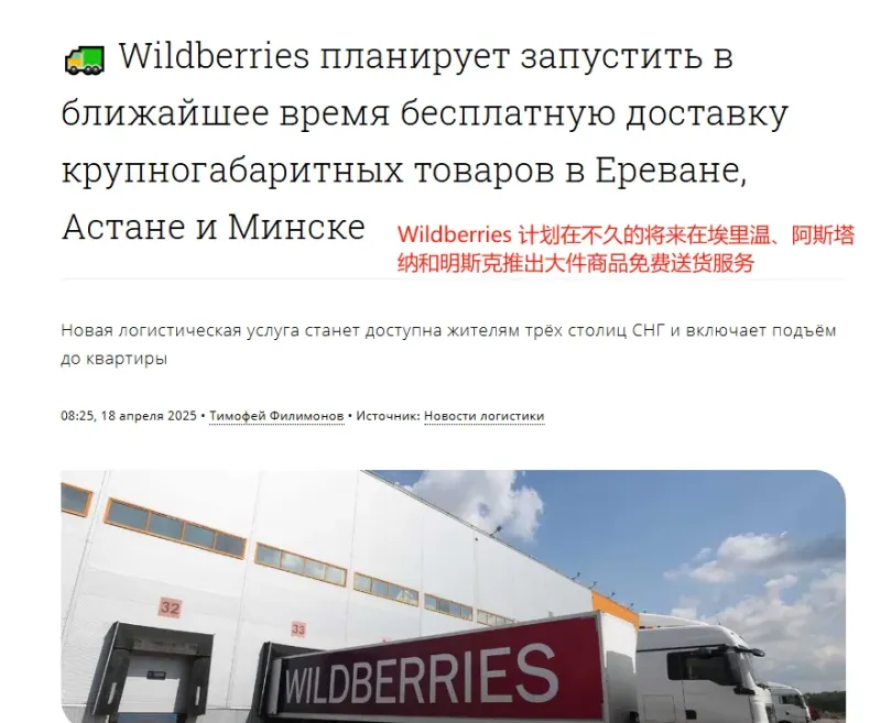 看中這一需求,Wildberries大件配送服務不斷拓展覆蓋范圍。截至目前,Wildberries貨物運送服務已覆蓋俄羅斯360多個地點。今年4月,該服務計劃上線埃里溫、阿斯塔納和明斯克三大市場,大件物流服務邁向國際化。