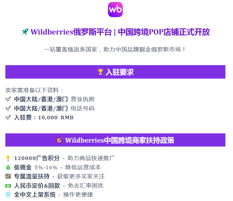 對(duì)于跨境賣家而言,Wildberries平臺(tái)開放的入駐政策無疑為其提供了一個(gè)拓展海外市場的絕佳機(jī)會(huì)。在入駐要求方面,雖然有一定門檻,但也為有實(shí)力的賣家提供了廣闊的發(fā)展空間。而為了幫助賣家更好地在平臺(tái)上開展業(yè)務(wù),Wildberries還提供了一系列的扶持與服務(wù)。比如說,在開放中國跨境POP店鋪的同時(shí)給予一定的扶持政策,包括廣告積分、低傭金、專屬流量扶持、全中文上架系統(tǒng)等等。