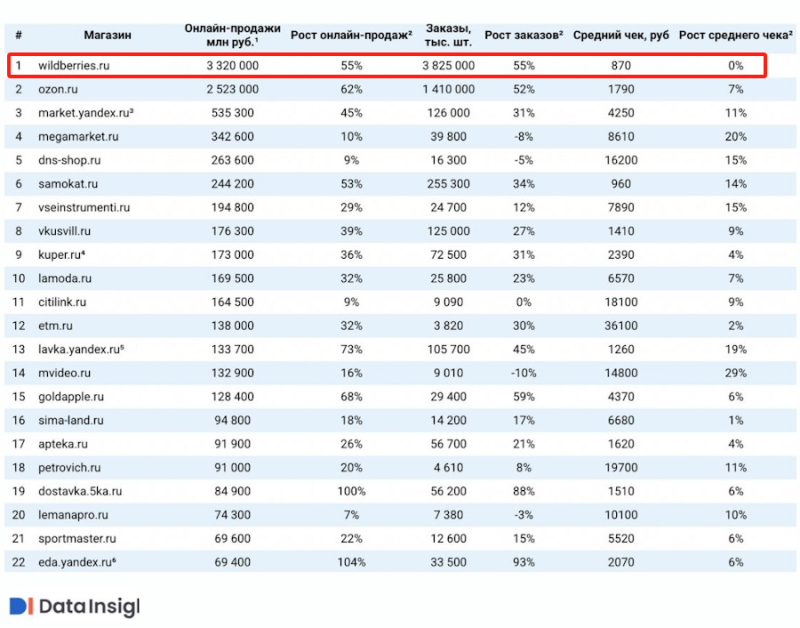 無獨(dú)有偶,研究公司Data Insight根據(jù)在線銷售額排名,基于收入、訂單數(shù)量、增長動(dòng)態(tài)和平均訂單數(shù)據(jù),發(fā)布了年度“俄羅斯百強(qiáng)在線商店評(píng)級(jí)”報(bào)告。其中,Wildberries的表現(xiàn)十分亮眼,再次成為俄羅斯電商市場的領(lǐng)跑者。數(shù)據(jù)顯示,2024年,Wildberries的銷售額為3.32萬億盧布,同比大漲55%,訂單量也漲了55%。值得一提的是,這已經(jīng)是它連續(xù)第九年登頂。