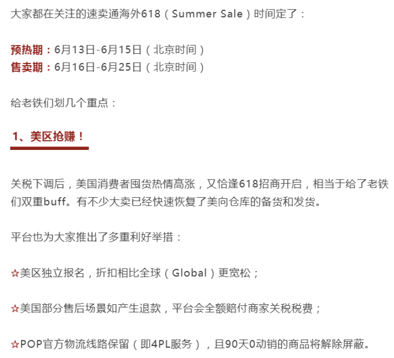 具體來看,隨著美區供給的全面復蘇,速賣通已經正式開啟了2025年的海外618招商,與此同時推出了多重利好舉措:美國招商折扣要求更加寬松;美國部分售后場景如產生退款,平臺會全額賠付商家關稅稅費;POP官方物流線路保留(即4PL服務),且90天0動銷的商品將解除屏蔽。
