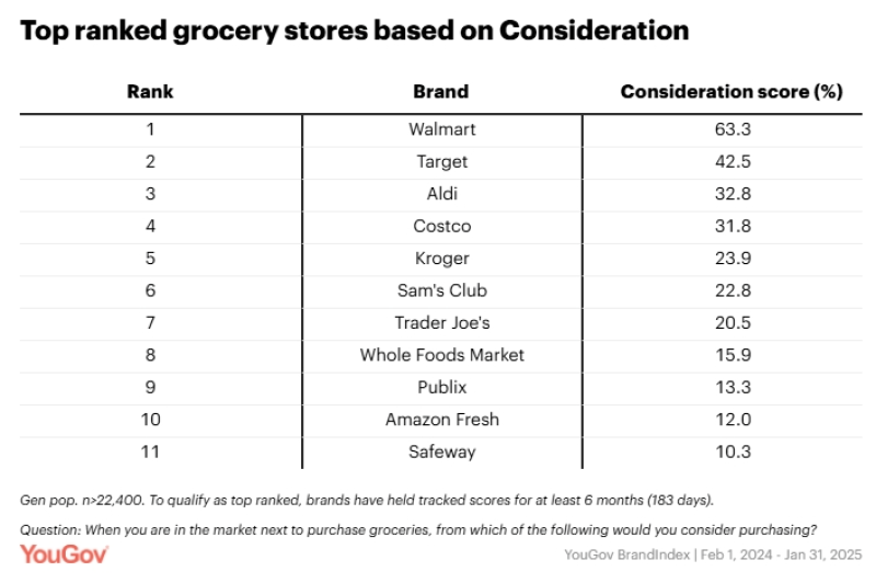 此外,在今年3月,市場調研機構YouGov也發布報告稱,沃爾瑪是美國人最喜愛的超市,也是主要消費群體的首選,有63.3%的美國成年人會優先考慮在沃爾瑪購物,這一比例遠超排名第二的塔吉特(42.5%),以及排名第三的阿爾迪(32.8%)。