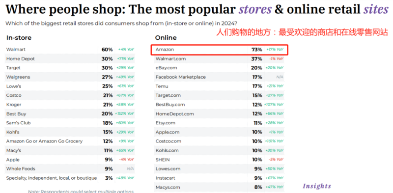 以美國市場為例,Jungle Scout發布的2025年度美國消費者趨勢報告顯示,2024全年有73%的消費者使用亞馬遜參與網購。在所有在線零售商中,亞馬遜的使用率位居第一。