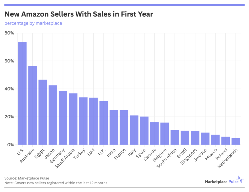 數據顯示,在過去12個月內,美國站點有超過73%的新賣家最終實現了銷售,其占比遠遠超出其他主要市場,例如德國(38%)、英國(32%)、加拿大(16%)。