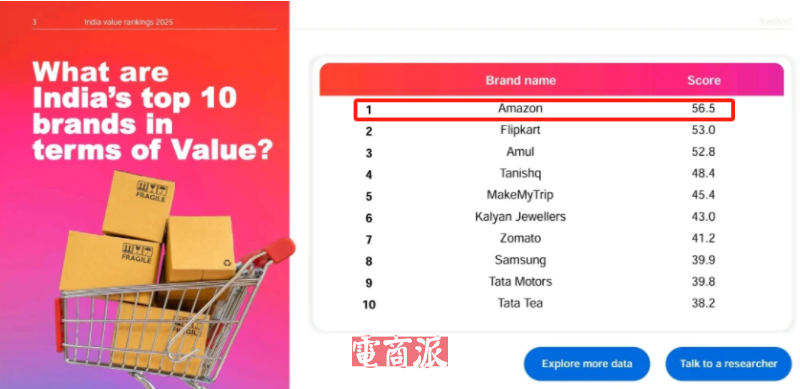 另外,在今年3月YouGov發布的最新的品牌價值指數報告中也直接指出,亞馬遜以56.5分的高分力壓一眾對手,直接登頂印度品牌價值榜榜首。