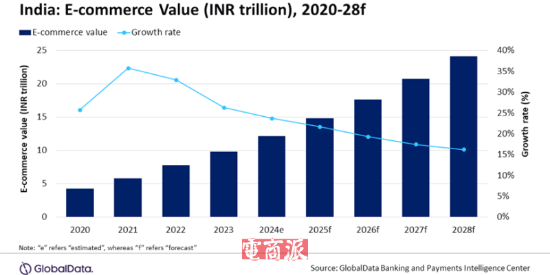 數據和分析公司GlobalData此前就發布研究指出,印度電商市場發展相當迅猛,2024年印度電商市場的規模將同比增長23.8%,達到驚人的12.2萬億印度盧比。并且這一數字還將繼續上漲,到2028年該電商市場規模有望增長到24.1萬億印度盧比,刷新歷史紀錄。
