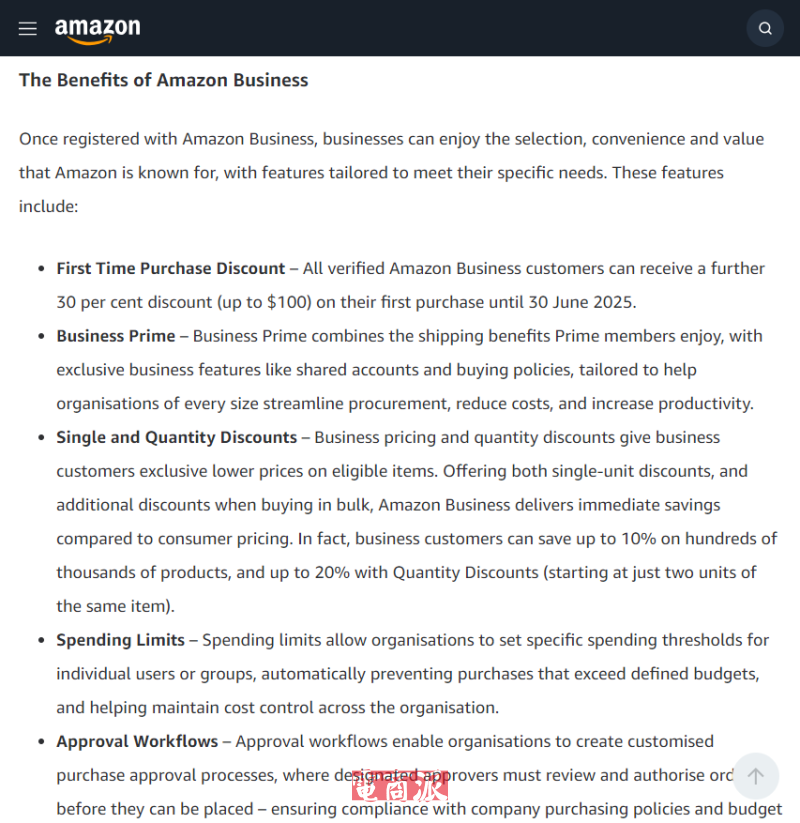 平臺上線即推出多項企業功能,包括Business Prime服務(提供免費配送、數據分析工具等)、引導式采購機制、支出管理系統以及可持續產品篩選器。為鼓勵企業注冊使用,亞馬遜還推出限時優惠:6月30日前,完成注冊與驗證的商業賬戶可享受最高100美元、30%的折扣優惠。