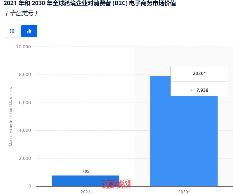 來自Cognitive Market Research發布的數據顯示,2024年,全球跨境電商市場規模為7915.422億美元,在2024年至2031年期間將以30.5%的復合年增長率(CAGR)擴大。無獨有偶,Statista的數據同樣揭示了這一積極趨勢,全球B2C跨境電商市場規模預計到2030年將達到7.9萬億美元,而在2021年,跨境網購行業規模大約只有7850億美元。