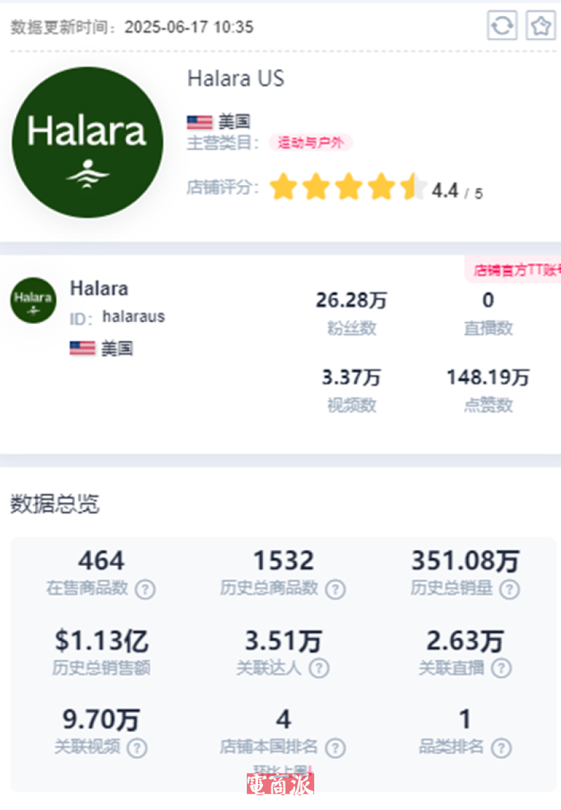 數據顯示,2024年8月,Halara在TikTok美區4個小店的總銷售額已達到6300萬美元(約合人民幣4.5億元)。截至目前,其最大的店鋪Halara US,粉絲數超26萬,歷史總銷售額達到1.13億美金,曾連續4個月蟬聯TikTok美區運動與戶外類目熱門小店榜第一。