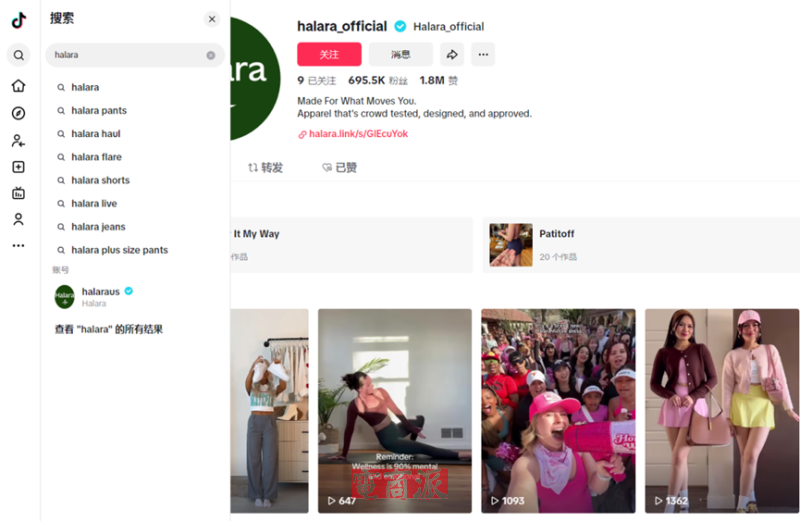 據了解,Halara在TikTok上采取多賬號運營模式,旗下賬號多達十數個,官方賬號粉絲數在600萬以上,同時Halara還大手筆砸錢,通過與大量海外中腰部和頭部網紅合作、用戶分享等快速搶占年輕女性消費者心智,為品牌帶來大量熱度和流量。