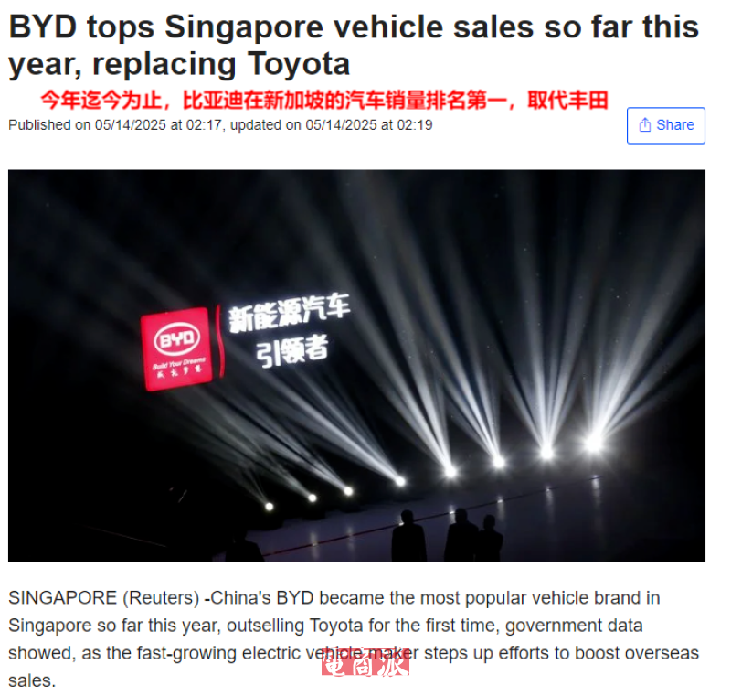 舉例來說,此前新加坡陸路交通局登記數據顯示,今年前4月比亞迪共售出3002輛汽車,占新加坡汽車總銷量的20%,同時也成為了今年以來新加坡最受歡迎的汽車品牌。