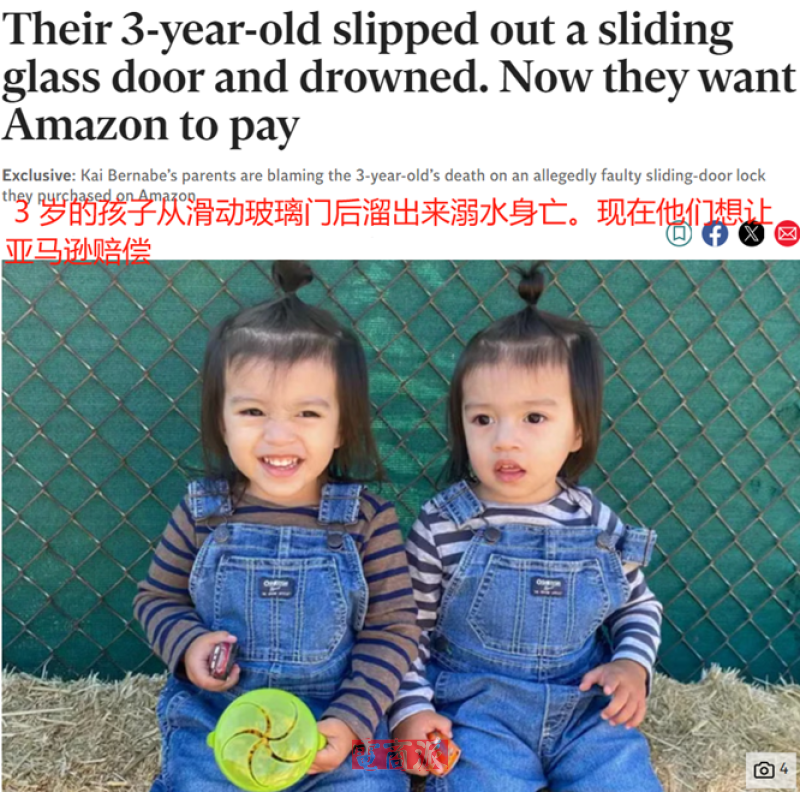 事件起因是一對美國夫妻在亞馬遜購買了一個滑動玻璃安全門鎖,用來鎖住通往后院的滑動玻璃門。沒想到,一天早晨,這對夫妻的雙胞胎兒子趁著家里人還在睡覺,偷偷破開了滑動門鎖,溜到后院游泳池玩耍,隨后不幸溺水,造成一死一傷。