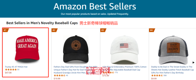 在前陣子的關(guān)稅大亂斗之時,特朗普竟然在亞馬遜平臺開了一家名為“Trump Store”的店鋪。進入店鋪主頁可以看到,該店鋪上架的商品種類豐富,多達54款,涵蓋了帽子、T恤、馬克杯、旗幟等多個品類,售價還不便宜。然而,Trump Store的銷售情況卻意外地好,上線一個多月,那頂標志性紅色棒球帽就賣出了1700多件,累計銷售額達到7.99萬美元,位居亞馬遜男士新奇棒球帽細分類目BSR榜單和女性新奇棒球帽細分類目BSR榜單的榜首位置。