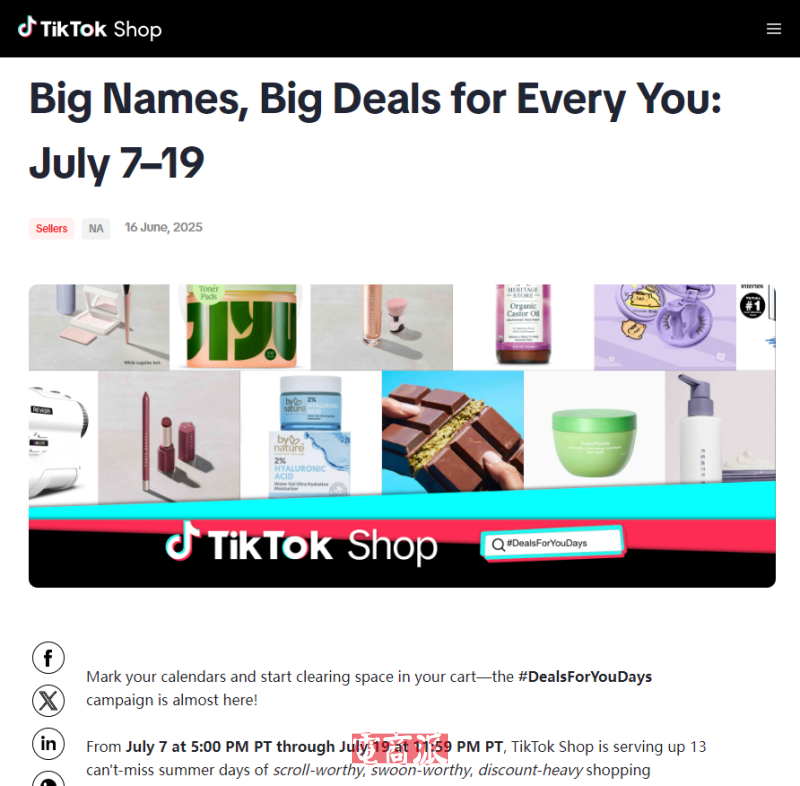 6月19日消息,TikTok Shop將于7月7日-19日舉辦“Deals for You Days”夏季促銷活動,期間全平臺各類商品和品牌將提供最高五折優惠。與此同時,TikTok Shop還推出了一項新的“直播比價保證”計劃。在此次活動中,參與直播購物的用戶如在其他平臺上發現同款商品價格更低,TikTok將向部分用戶返還差價。