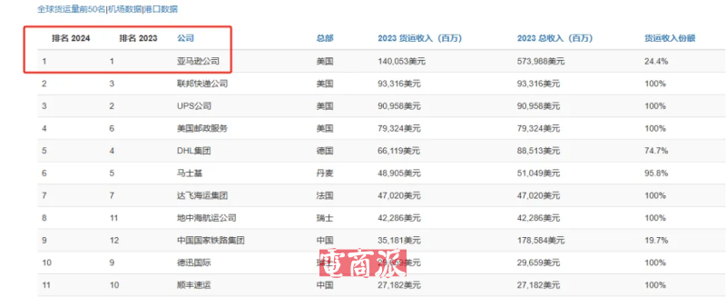 說到物流領(lǐng)域,亞馬遜可以說是一匹黑馬,依托長時間積累的基礎(chǔ)設(shè)施和龐大完善的物流體系,在物流領(lǐng)域的實力和地位正越來越強,對各大物流商的威脅也逐漸擴大。從Transport Topics公布的《全球貨運企業(yè)50強榜單》中可以看到,亞馬遜在2023年和2024年力壓UPS、FedEx、DHL等一眾物流巨頭,成為全球最大的貨運公司。