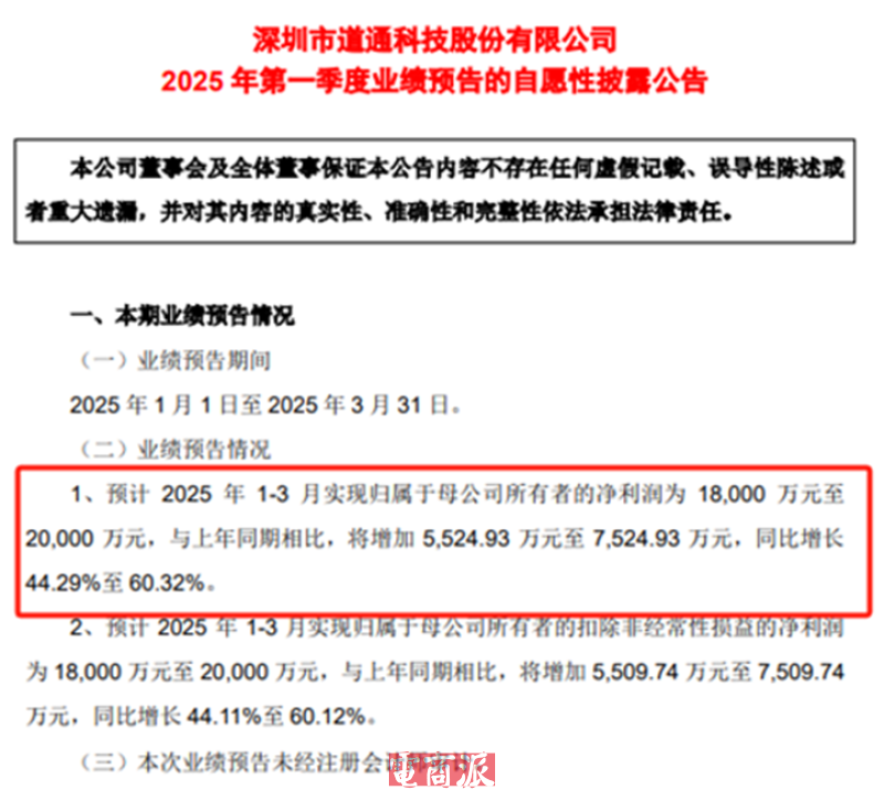 深圳大賣道通科技同樣是AI電商的受益者,2025年第一季度,道通科技預計實現歸屬于母公司所有者的凈利潤為18000萬元以上,同比增長44.29%至60.32%。該公司解釋稱,業績上漲的原因是報告期內,公司持續大力推進“全面擁抱AI”戰略,加速推動AI技術和業務場景的深度融合,從而有效提升了競爭力和市場占有率。