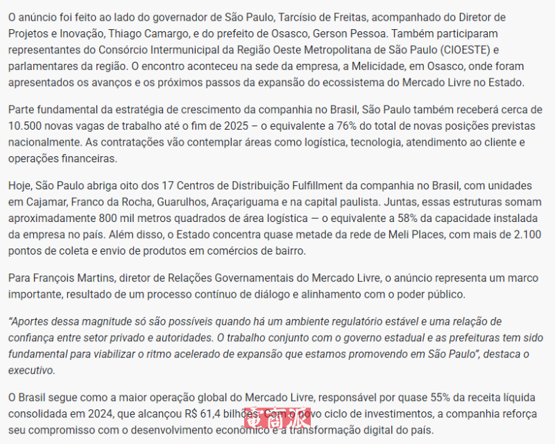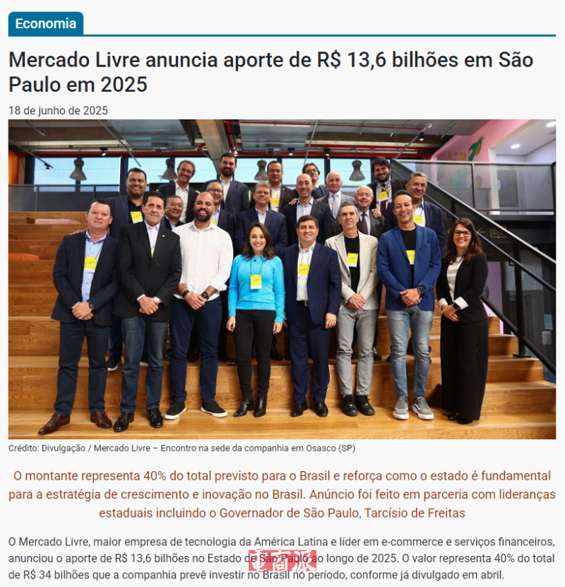 6月19日消息,美客多宣布將在巴西圣保羅州投資136億雷亞爾(約25億美元),強化其在巴西的戰略布局。此項投資約占美客多計劃在2025年向巴西投資340億雷亞爾的40%。本次投資聚焦物流、技術、客戶服務及金融服務等關鍵領域,預計在巴西創造1.4萬個就業崗位,其中超過75%、即1.05萬個崗位將落地圣保羅州。