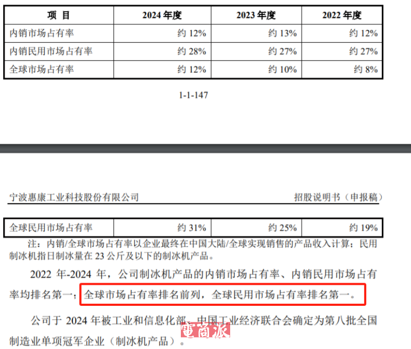 早些年,惠康科技就深刻洞悉到了國外市場對冰塊的需求量極大,于是開始研發家用制冰機。第一年打入北美市場,銷量便超10萬臺,初戰告捷。經過多年的努力與發展,惠康科技在海外市場取得了亮眼目的成績。招股書指出,其產品已成功覆蓋全球80余個國家和地區,在市場份額方面的表現更是一騎絕塵:2022年至2024年,惠康科技制冰機全球市場占有率排名前列,全球民用市場占有率排名第一。
