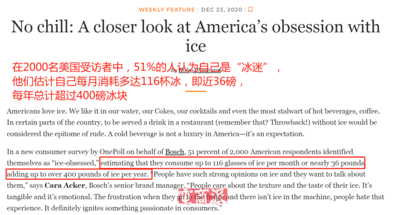 在餐廳里,冰塊常用于冰鎮飲料、保鮮食材;酒吧中,各類雞尾酒更是離不開冰塊的點綴;家庭聚會時,人們也喜歡用冰塊調制清涼飲品。有調查指出,美國人均每年冰塊消耗量高達400磅,不管是早餐時的冰咖啡、午餐后的冰可樂,還是晚餐要喝上一口的冰啤酒,冰塊幾乎出現在他們每一頓餐飲的飲品之中。
