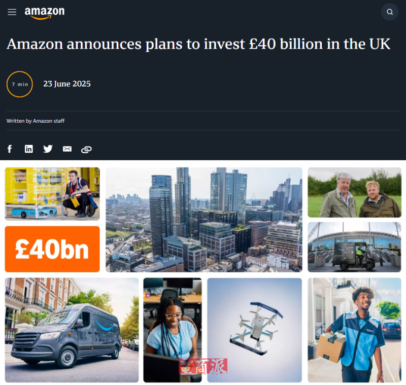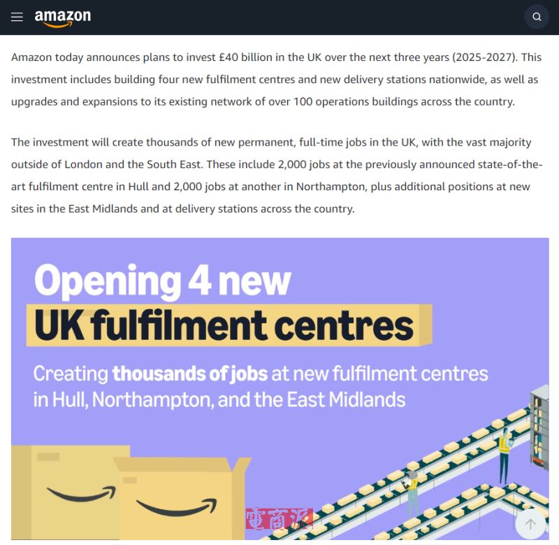亞馬遜計劃未來三年在英國投資400億英鎊