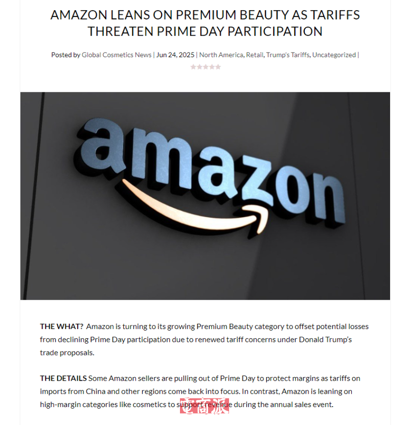 6月25日消息,亞馬遜即將于7月8日-11日舉行為期四天的Prime Day促銷活動,平臺正在加碼推廣高利潤的高端美妝產(chǎn)品,以抵消Prime Day參與度下降帶來的潛在損失。由于美國關(guān)稅帶來的潛在銷售壓力,部分依賴中國等高稅率市場供貨的賣家選擇退出此次促銷活動,以保護(hù)利潤空間。亞馬遜希望通過Amazon Premium Beauty板塊的銷售增長,來緩沖關(guān)稅對營收和消費(fèi)者信心的影響。