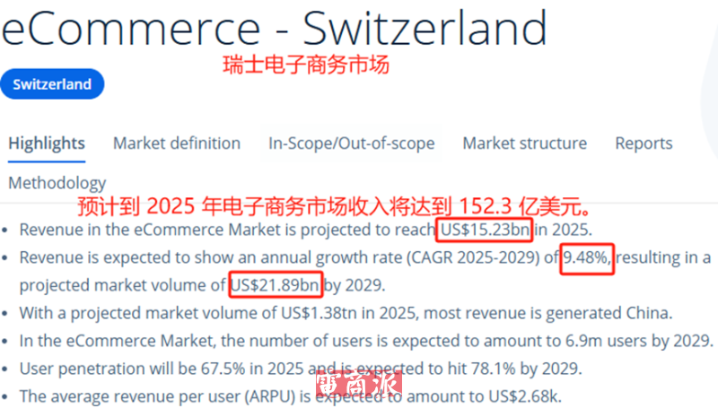 Statista的數據就顯示,瑞士電子商務市場增速喜人,2025年,該市場預計年收入為152.3億美元,到2029年,這一數值有望突破200億美元,達到218.9億美元,統計期內復合年增長率為9.48%。