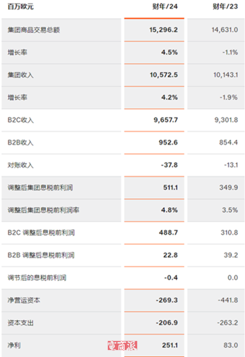 財報數據顯示,2024財年,Zalando的總商品交易量增長了4.5%,達153億歐元;收入也較上年同比增長了4.2%,達105億歐元,創下新紀錄。與此同時,該平臺的利潤增長也超出預期,過去一年,其凈利潤達到2.51億歐元,比上年同期增長約200%。
