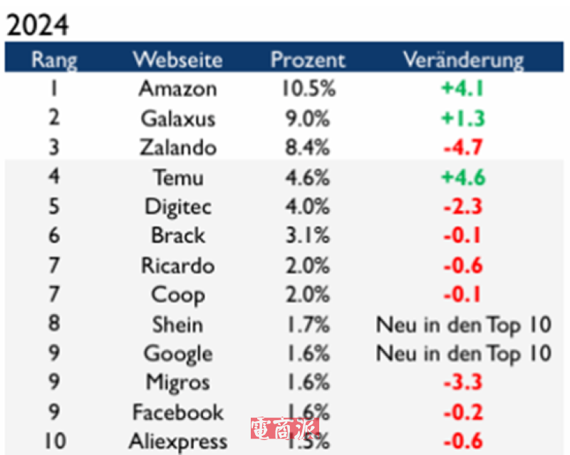 Temu闖進瑞士最受歡迎網購平臺榜前四 圖源:ecommercenews.eu