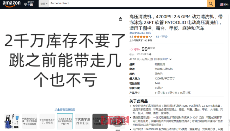 就在前不久,亞馬遜上一款月銷量可觀的高壓清洗機鏈接產品主圖被修改,原本展示產品的主圖變成了中文文字圖片,內容為“寧波某品牌,喜歡惡意競爭讓你出名”“下半年啥也不干了,陪你玩”“2000萬庫存不要了,跳之前能帶走幾個也不虧”。原來這是賣家在怒懟惡意跟賣,雖然“傷敵一千自損八百”,但也是沒辦法中的辦法。