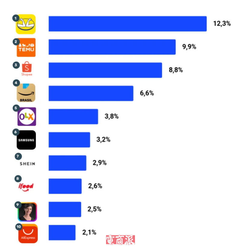 一方面,新興電商勢力陸續進入巴西市場。去年6月,Temu正式登陸巴西,一上線便展露出黑馬之勢,當月下載量進入巴西全應用榜前11、購物類應用榜前4;次月,更是直接沖上全應用下載榜第一。現在,按流量份額計算,Temu已躍升為巴西第二大電商平臺。