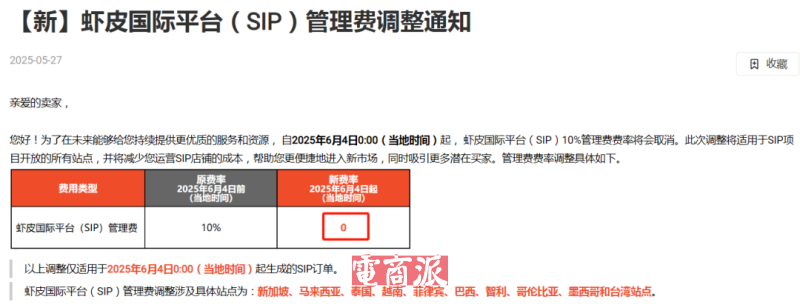 不久前,Shopee發布通知稱,為了在之后能夠為平臺賣家帶來更加優質的服務和資源,幫助賣家減少店鋪運營的成本,自2025年6月4日起Shopee國際平臺(SIP)將全面取消10%的管理費費率,包括新加坡、馬來西亞、泰國、越南、菲律賓、巴西、智利、哥倫比亞、墨西哥和臺灣站點。