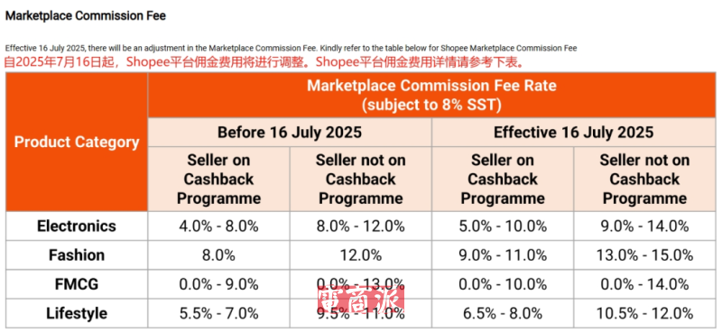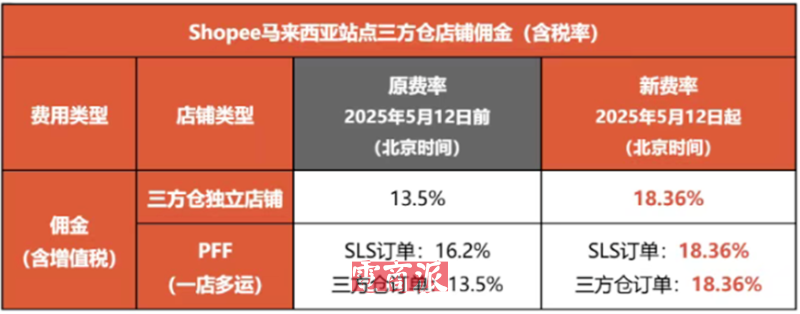 例如在自5月12日起,Shopee馬來西亞站點跨境直郵店鋪傭金費率從此前的16.2%上調為18.6%(含稅率),馬來西亞站點三方倉獨立店鋪以及一店多運生成的SLS和三方倉訂單,含增值稅傭金也統一上調至18.36%。