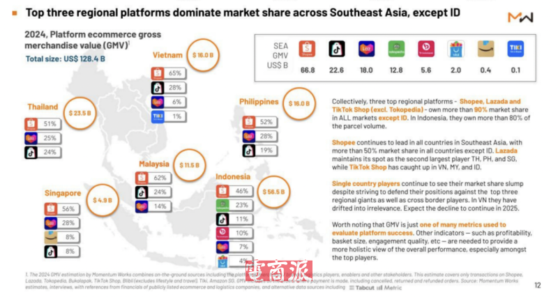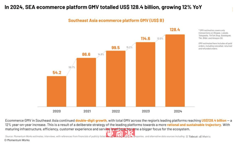6月26日消息,新加坡咨詢公司Momentum Works發布《東南亞電商報告3.0》顯示,2024年東南亞地區的電商平臺交易總額(GMV)達到1284億美元,同比增長12%。若將平臺外渠道(如品牌官網、多品牌零售商、社交平臺及WhatsApp電商)納入統計,總電商交易規模將達到1452億美元,滲透率達12.8%。