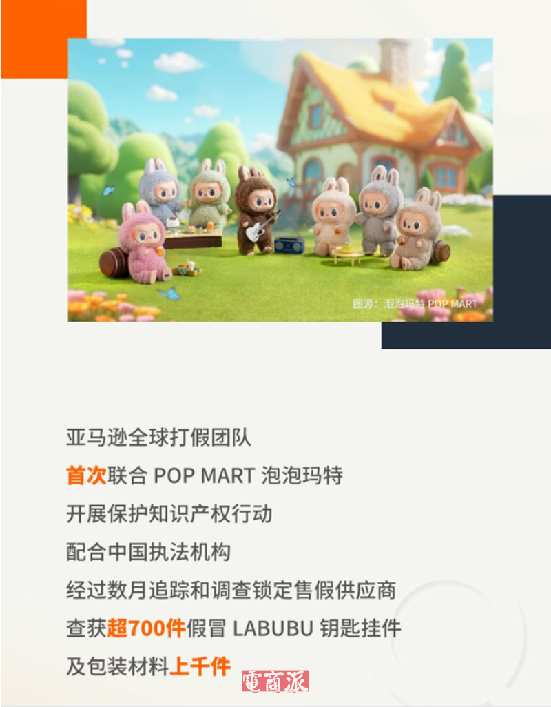 不久前,亞馬遜就首次聯合泡泡碼特,開展了保護知識產權行動,查獲了超700件假冒LABUBU鑰匙掛件及包裝材料上千件,成功保護了泡泡碼特的品牌聲譽和知識產權。