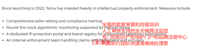 多說不如多做,在實際打假層面,Temu也拿出了誠意,不僅在打擊假貨和知識產權執法方面投入了大量資金,同時推出了多種舉措為Temu電商生態環境保駕護航,包括全面的賣家審查和合規培訓機制、人工審核支持的全天候算法監控、專門的知識保護門戶以及品牌注冊中心等。