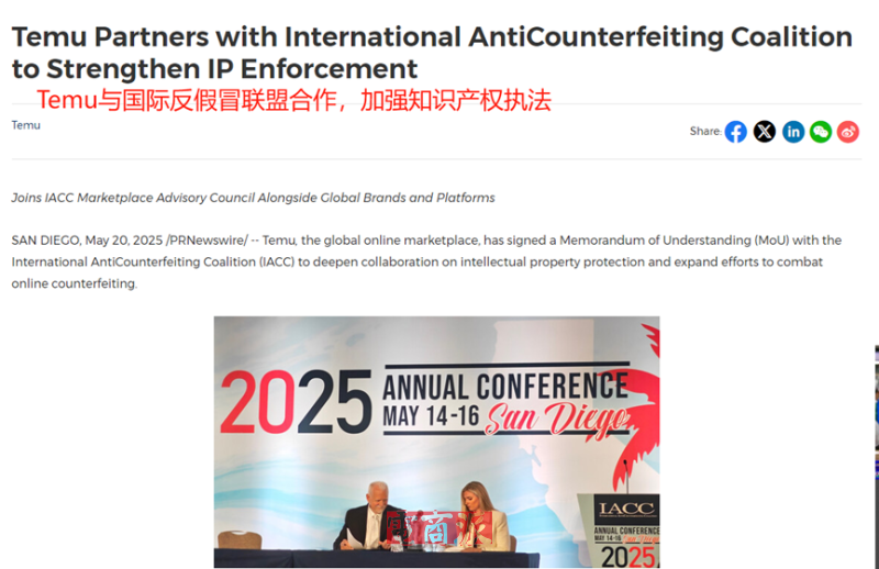 今年5月,在國際反假冒聯盟年會上,拼多多海外分支Temu與IACC簽署了一份諒解備忘錄,宣布共同深化知識產權保護的合作。作為協議的一部分,Temu還將作為創作成員,加入IACC新成立的市場咨詢委員會MAC。