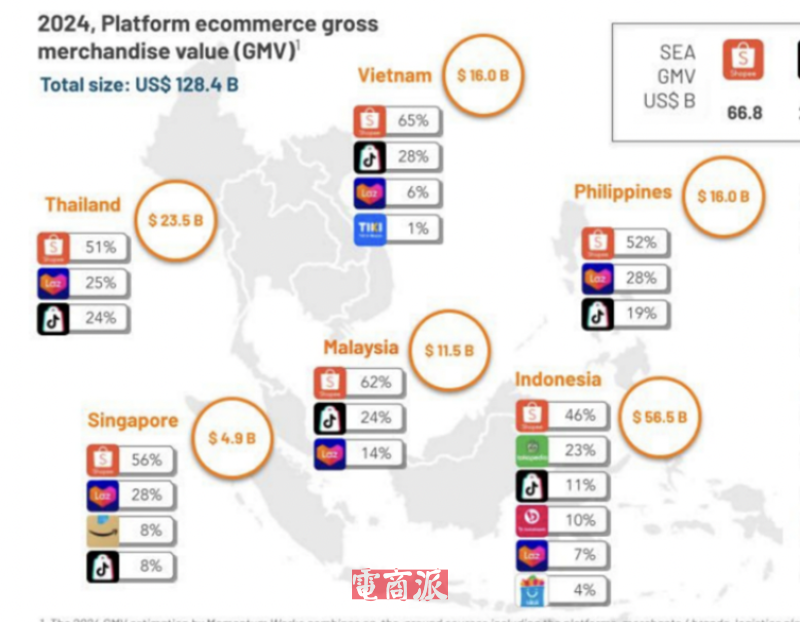 其中,Shopee貢獻的交易額是最多的,過去一年,該平臺憑借668億美元的GMV穩坐東南亞頭把交椅,市場份額占比達到驚人的52%,直接攬下半壁江山,這主要得益于其廣泛的用戶基礎、本地化運營策略的深化以及物流網絡和商業化能力的不斷升級。