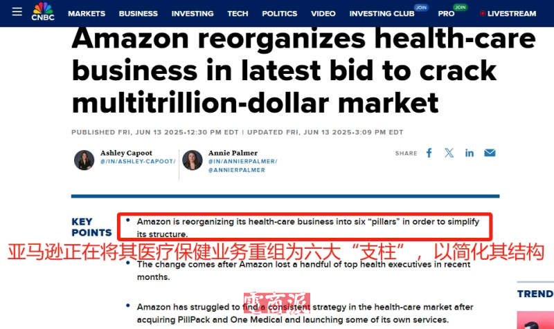 亞馬遜將醫療保健業務重組為六大支柱?圖源:CNBC