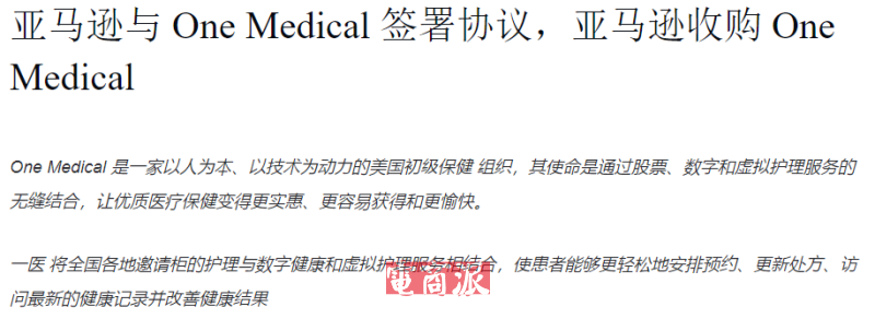 而在2022年,亞馬遜選擇斥資39億美元收購初級醫療服務提供商One Medical,One Medical?是美國一家獨立高端初級醫療服務提供商,成立于2007年,通過結合面對面、數字和虛擬護理服務,致力于為全美消費者提供低成本、高質量的醫療服務。?