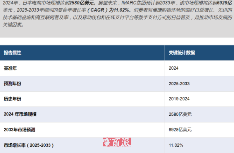 另一方面,單純就日本的電商市場規模來看,這里也是一個重要的跨境掘金場,畢竟日本可是全球第四大電商市場,增長機會多多。數據是更有說服力的證明,Imarc Group指出:2024年,日本電商市場規模達到2580億美元,這一數字到2033年或將能夠達到6928億美元,2025-2033年期間的復合年增長率(CAGR)為11.02%。