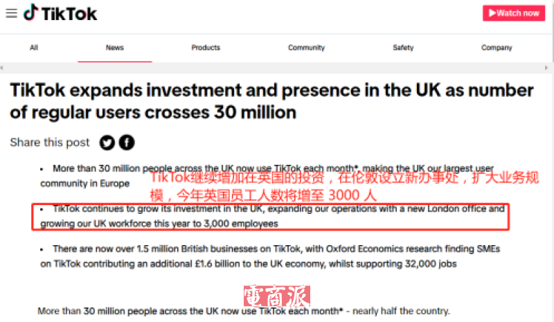除了不斷開發新站點,TikTok還持續加碼現有業務陣地,試圖把每一塊蛋糕都做大一點。比如說,前不久TikTok表示要加大在英國市場的投資力度,在倫敦設立新的辦公室,擴大業務規模。