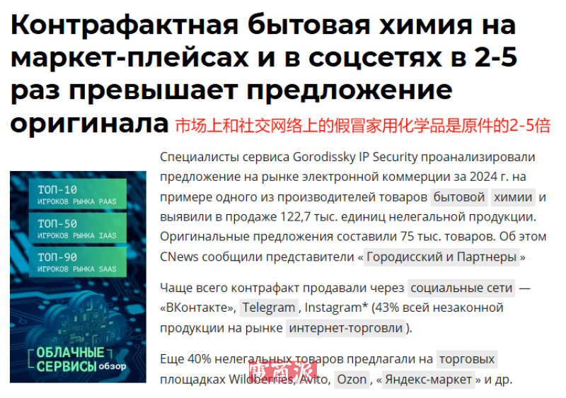 由于俄羅斯輕工業基礎相對薄弱,部分商品依賴進口,這就給一些不法商家提供了可乘之機。例如此前Gorodissky知識產權安全公司就指出,光是在2024年,俄羅斯電商市場就有12.27萬件非法銷售的家用化學品,遠超最初報告的7.5萬件。?